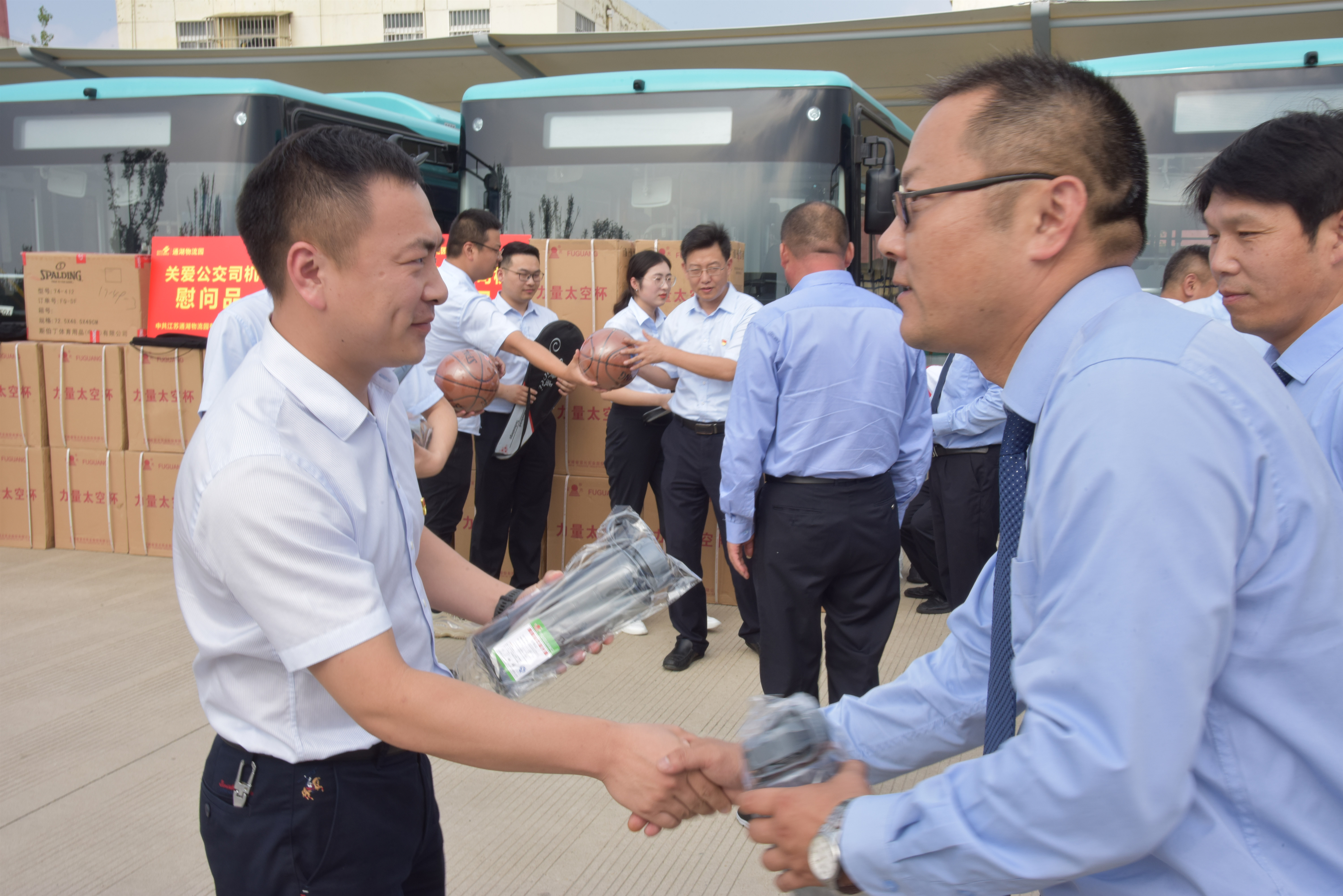 公交駕駛員作為一個特殊的職業(yè)群體,擔(dān)負(fù)著繁重的公共交通運輸任務(wù),工作時間長、精神高度集中、勞動強度大、安全責(zé)任重、服務(wù)要求高。為關(guān)懷公交駕駛員的身心健康、豐富業(yè)余生活,通湖物流園黨支部與公交場站支部共建,在黨員活動日當(dāng)天為一線駕駛員送上水杯、羽毛球拍、籃球等慰問品,為炎熱的夏天送上一絲絲清涼。最后,通湖物流園與公交公司的同事們還開展了籃球友誼賽,增進雙方友誼。