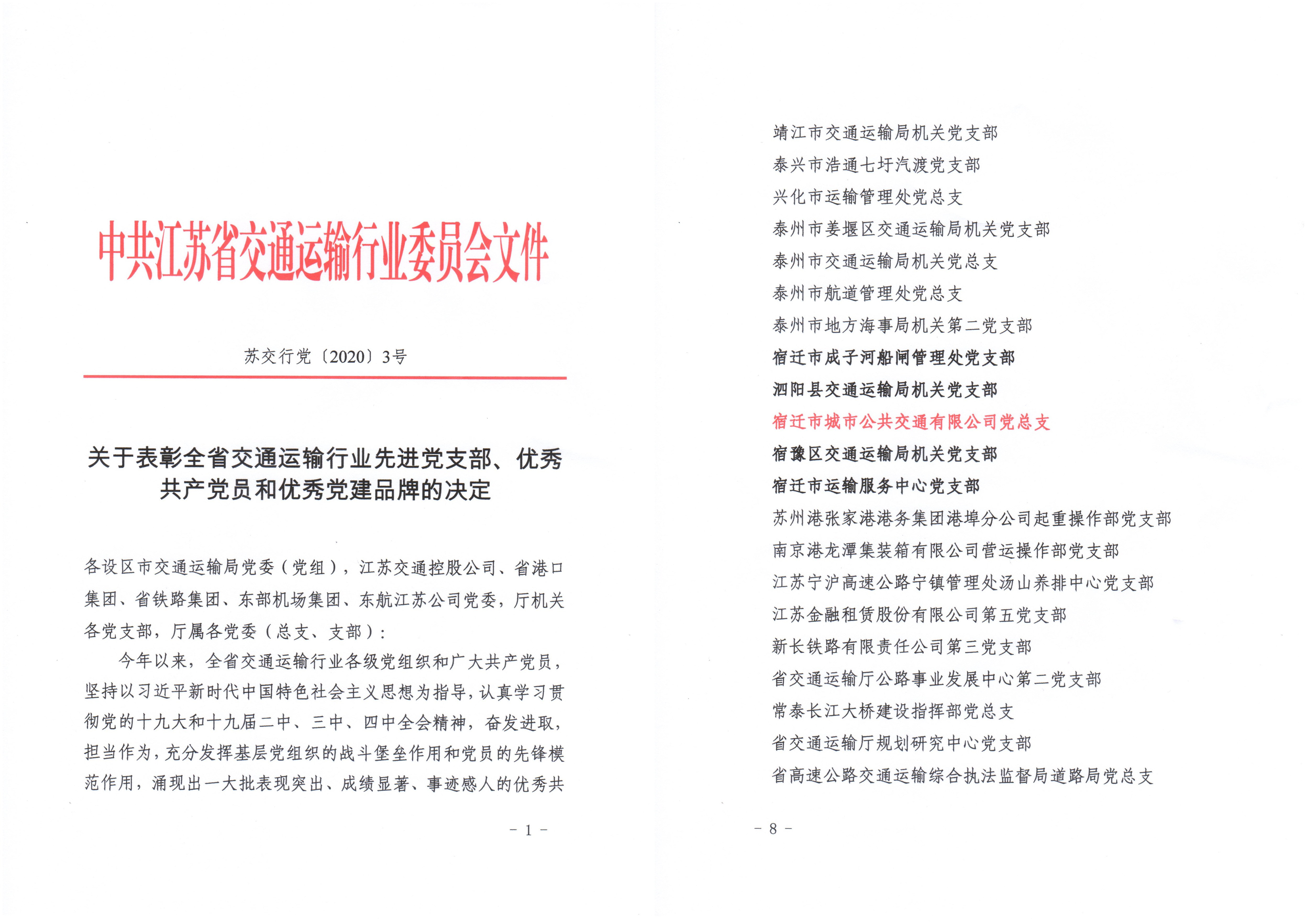 7月15日,中共江蘇省交通運(yùn)輸行業(yè)委員會發(fā)布《關(guān)于表彰全省交通運(yùn)輸行業(yè)先進(jìn)黨支部、優(yōu)秀共產(chǎn)黨員和優(yōu)秀黨建品牌的決定》,公交公司黨總支被評為全省交通運(yùn)輸行業(yè)先進(jìn)黨支部。