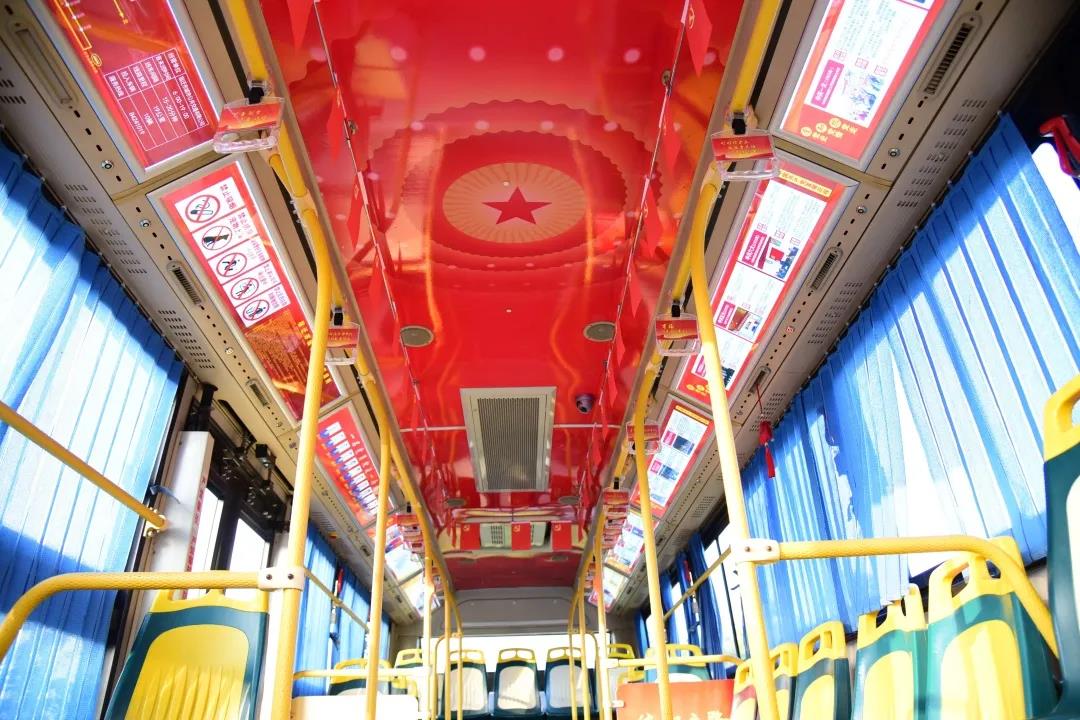 這條紅色主題車廂文化的打造格外引人注目,整車以鮮艷的中國紅打底,以公交車廂為載體,以紅色基調(diào)布置的車廂讓乘客感受到濃濃的國慶氛圍,身處其中仿佛置身于歷史時(shí)空的長廊,享受著視覺上的一場(chǎng)盛宴。