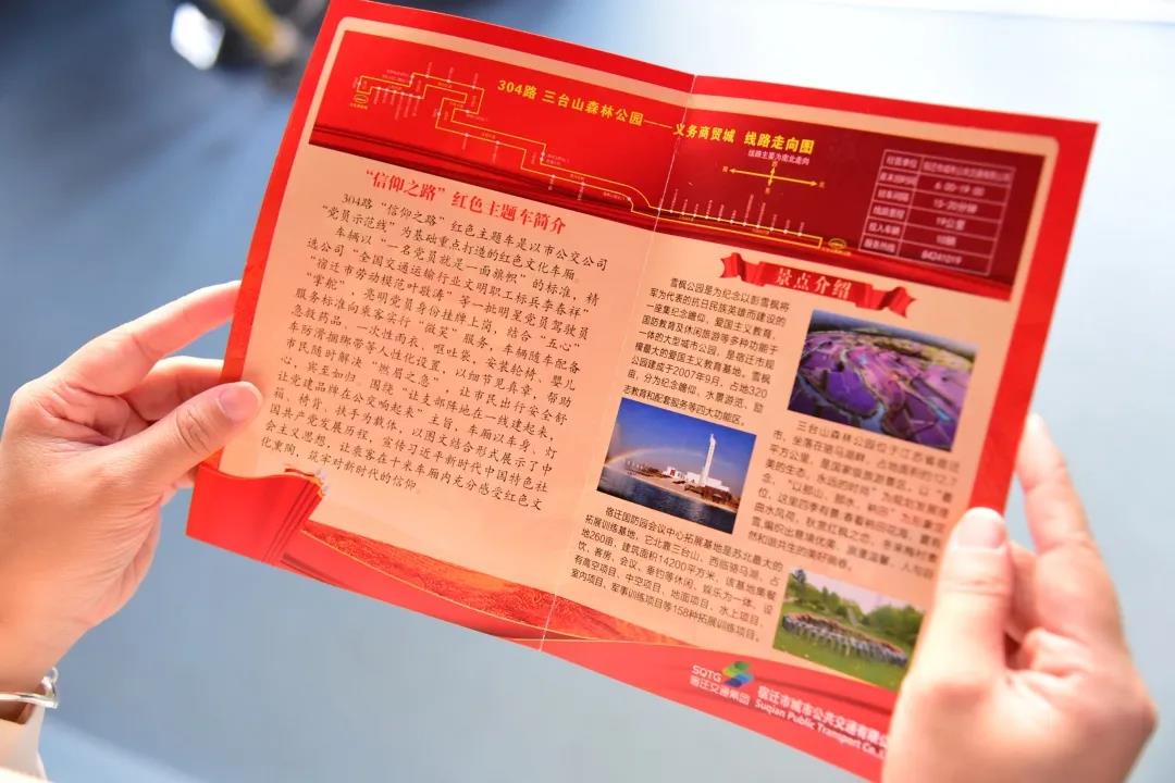 304線路起訖宿遷·義烏國際商貿(mào)城——三臺(tái)山國家森林公園站,串連雪楓公園、宿遷市國防園會(huì)議中心、三臺(tái)山國家森林公園等多個(gè)黨性教育景點(diǎn)。公交公司以線路為依托,細(xì)心的印制了“信仰之路宣傳冊(cè)”,里面包括了景點(diǎn)介紹、主題車簡(jiǎn)介等內(nèi)容。乘客乘車時(shí)不僅能欣賞沿途風(fēng)光,更能隨手拿起宣傳冊(cè),邊看邊讀,一站式游覽宿遷紅色旅游文化,領(lǐng)略城市歷史底蘊(yùn)和文明宿遷風(fēng)土人情,彰顯了“人文公交”的服務(wù)內(nèi)涵。