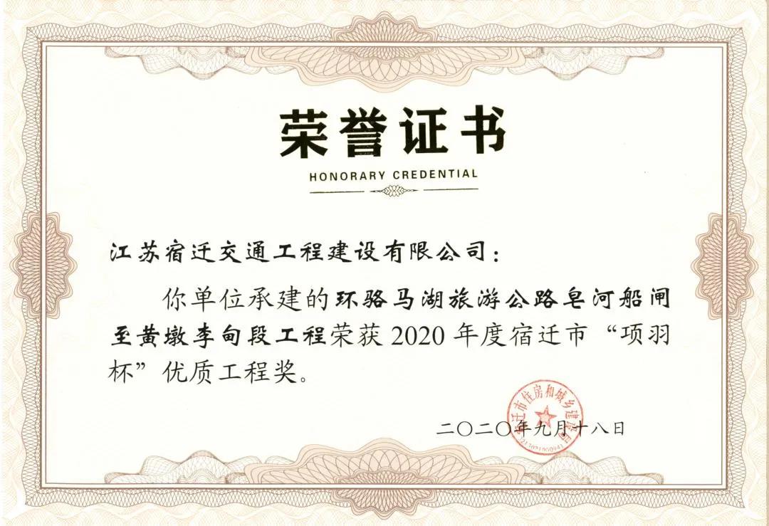 近日,由宿遷交建承建的環(huán)駱馬湖旅游公路皂河船閘至黃墩李甸段工程和運(yùn)河宿遷港徐淮公路改造項(xiàng)目榮獲2020年度宿遷市“項(xiàng)羽杯”優(yōu)質(zhì)工程獎(jiǎng)。