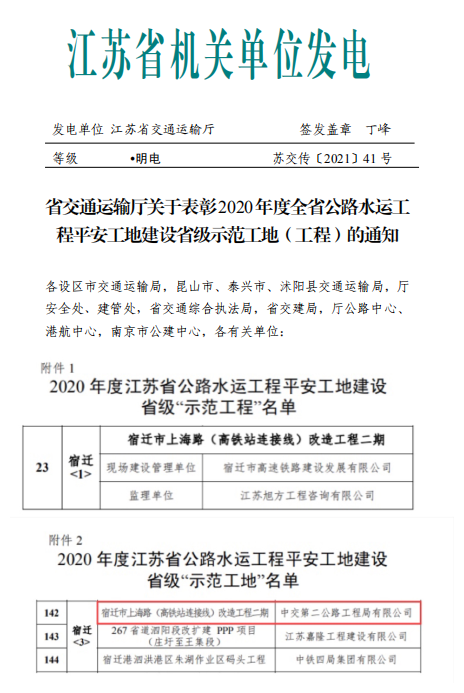 近日,江蘇省交通運(yùn)輸廳公布了2020年度全省公路水運(yùn)工程平安工地建設(shè)省級“示范工地(工程)”名單,由高鐵公司承建的上海路(高鐵站連接線)改造工程二期光榮上榜。至此,市綜合客運(yùn)樞紐工程、市高鐵商務(wù)區(qū)市政配套工程等該公司所有承建項目均獲得平安工地“示范工地”稱號。