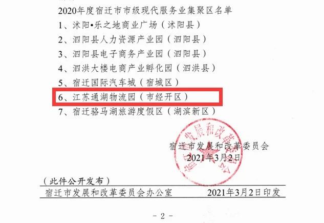 近日,市發(fā)展改革委公布了2020年度宿遷市市級現(xiàn)代服務(wù)業(yè)集聚區(qū)名單,通湖物流園被認(rèn)定為宿遷市市級現(xiàn)代服務(wù)業(yè)集聚區(qū)。