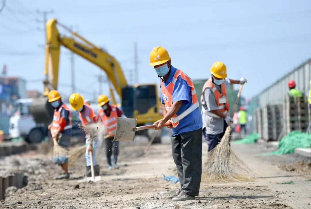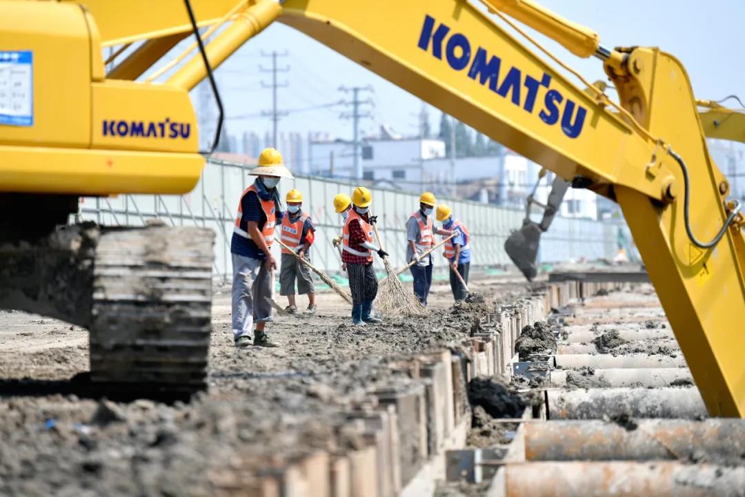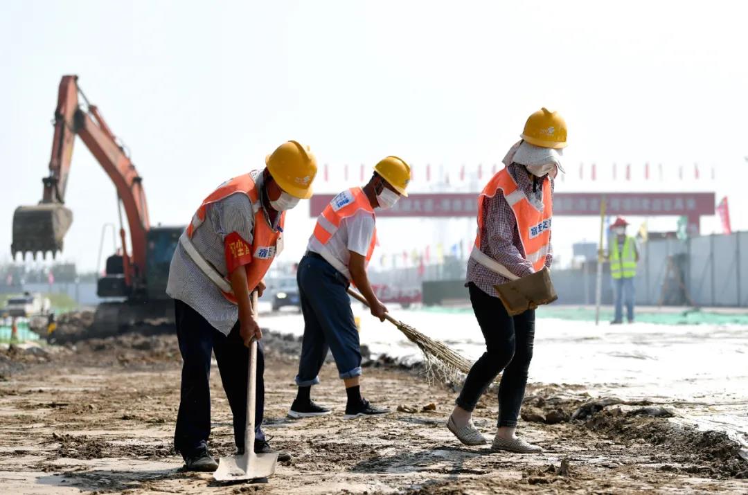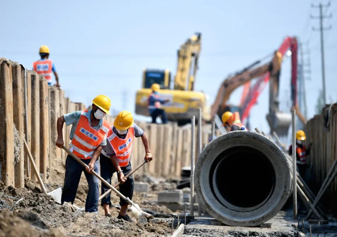 8月30日,徐淮路(通湖大道-淮徐高速公路宿遷西互通段)改造工程施工現(xiàn)場,工人正緊鑼密鼓地進行施工。