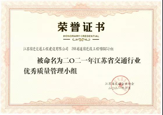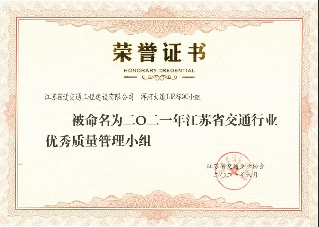 近日,宿遷交建268省道宿遷段工程項目QC小組、洋河大道TJ2標QC小組、宿遷市高鐵商務區(qū)路網工程QC小組被江蘇省交通企業(yè)協會授予“2021年度江蘇省交通行業(yè)優(yōu)秀質量管理小組”稱號。