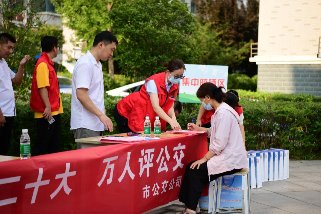 在白堡社區(qū),工作人員熱情邀請(qǐng)群眾為公交服務(wù)滿意度“打分”,并征求群眾對(duì)公交服務(wù)的意見和建議,受到群眾的好評(píng)。