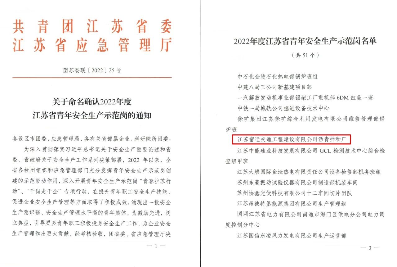 【宿遷交建】瀝青拌和廠被評為“2022年度江蘇省青年安全生產(chǎn)示范崗”