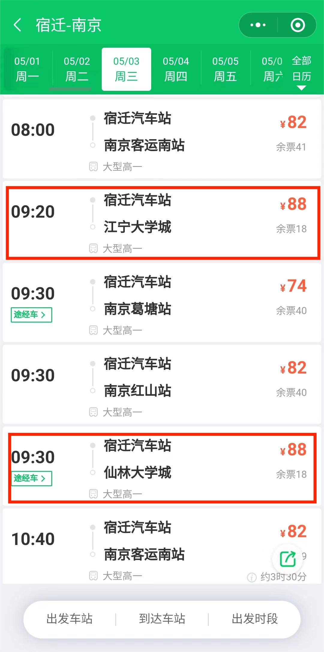不必?fù)?dān)心!為方便宿遷學(xué)子假期返校,5月3日,宿遷汽車(chē)客運(yùn)站推出直達(dá)南京仙林大學(xué)城、江寧大學(xué)城兩條班線,同學(xué)們可以直接享受從家到大學(xué)城的一站式體驗(yàn),也可以選擇赴客運(yùn)站乘坐,免去中途換乘煩惱,實(shí)現(xiàn)家到學(xué)校的“一車(chē)直達(dá)”!