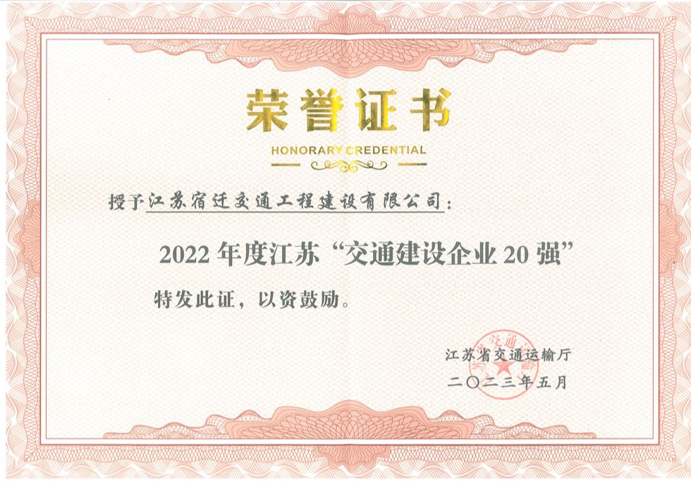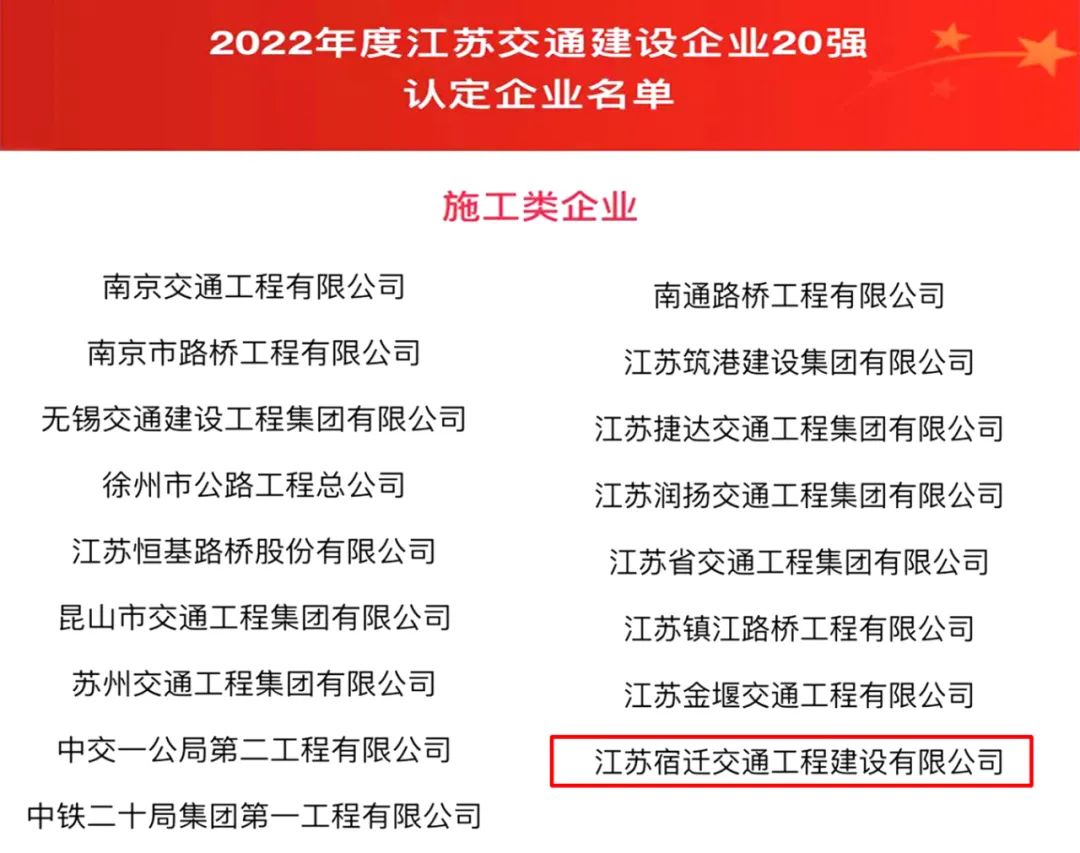 【宿遷交建】我市唯一!宿遷交建入選2022年度江蘇交通“建設(shè)企業(yè)20強”