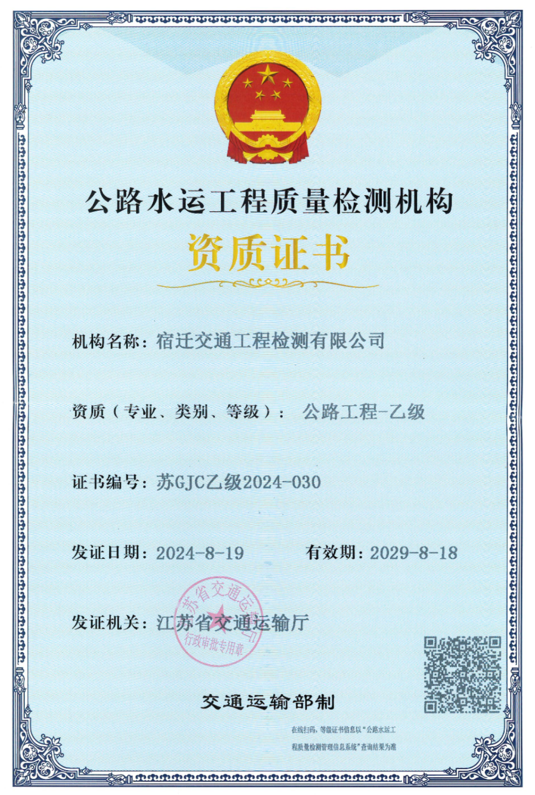 【宿遷交建】宿遷交建檢測(cè)公司順利通過公路工程綜合乙級(jí)資質(zhì)延續(xù)審批