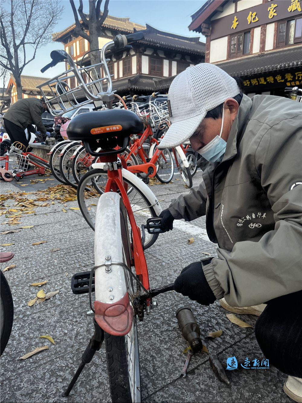 “這輛車的坐墊和車鏈都有問題,都要換新的。”11月29日上午,在市區(qū)項王故里景區(qū)附近的一個公共自行車站點,交通科技的工作人員正在為公共自行車進行保養(yǎng)、維修。