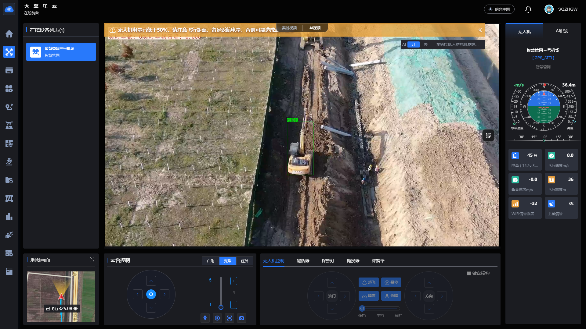 日常工作期間,“智能巡檢員”按照預(yù)設(shè)航線自動(dòng)巡檢,配置高精度變焦相機(jī),依托“平臺(tái)+無人機(jī)+AI”技術(shù),實(shí)時(shí)捕捉未佩戴安全帽、圍擋破損傾覆等典型隱患行為,并自動(dòng)標(biāo)記位置、推送預(yù)警、督促整改,形成全鏈條管理閉環(huán)。巡航過程中,還實(shí)時(shí)監(jiān)控工程車輛位置與作業(yè)狀態(tài),智能識(shí)別違規(guī)占道、超區(qū)域作業(yè)等異常情況,及時(shí)提醒優(yōu)化施工動(dòng)線。