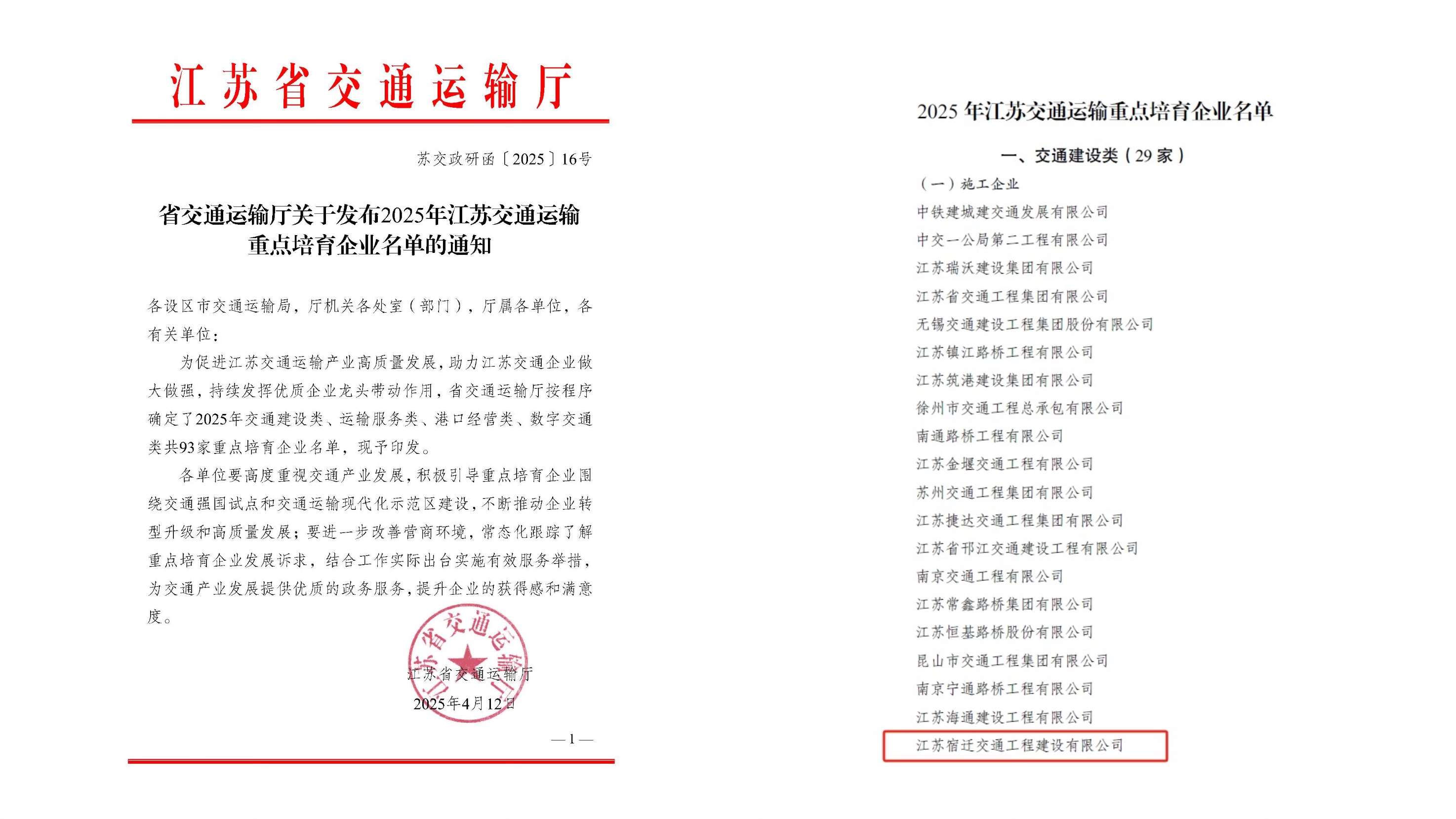 近日,江蘇省交通運輸廳正式揭曉《2025年江蘇省交通運輸重點培育企業(yè)名單》,其中,宿遷交建憑借綜合實力、技術(shù)創(chuàng)新能力等方面優(yōu)勢成功入選。自2023年入選首屆“江蘇交通建設(shè)企業(yè)20強(qiáng)”,到2024年完成更名后再度蟬聯(lián)這一榮譽,宿遷交建用實力彰顯了其在全省交通建設(shè)領(lǐng)域的地位,詮釋著國有企業(yè)的使命擔(dān)當(dāng) 。