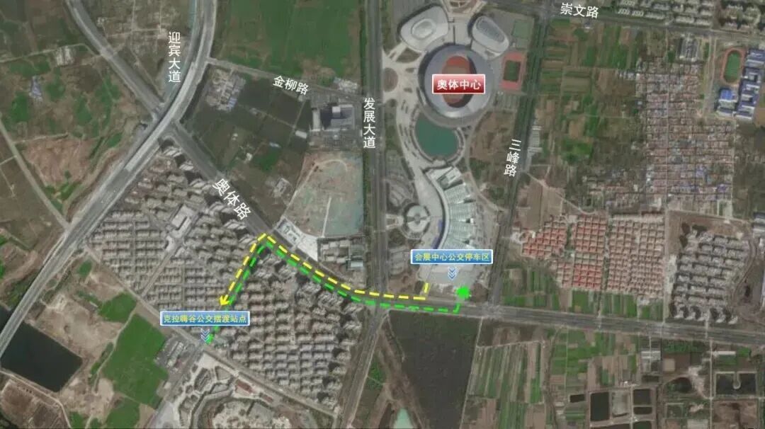學(xué)成路停車區(qū)—奧體中心(循環(huán)擺渡):迎賓大道——學(xué)成路——三峰路——崇文路(奧體北門)