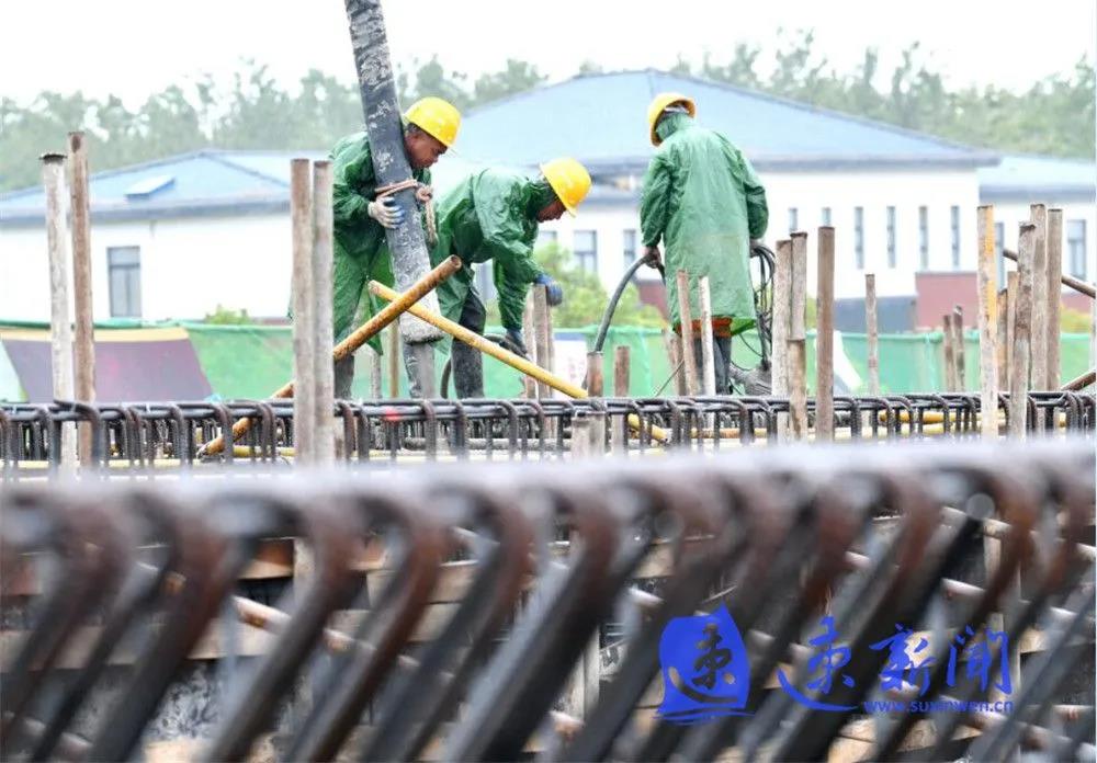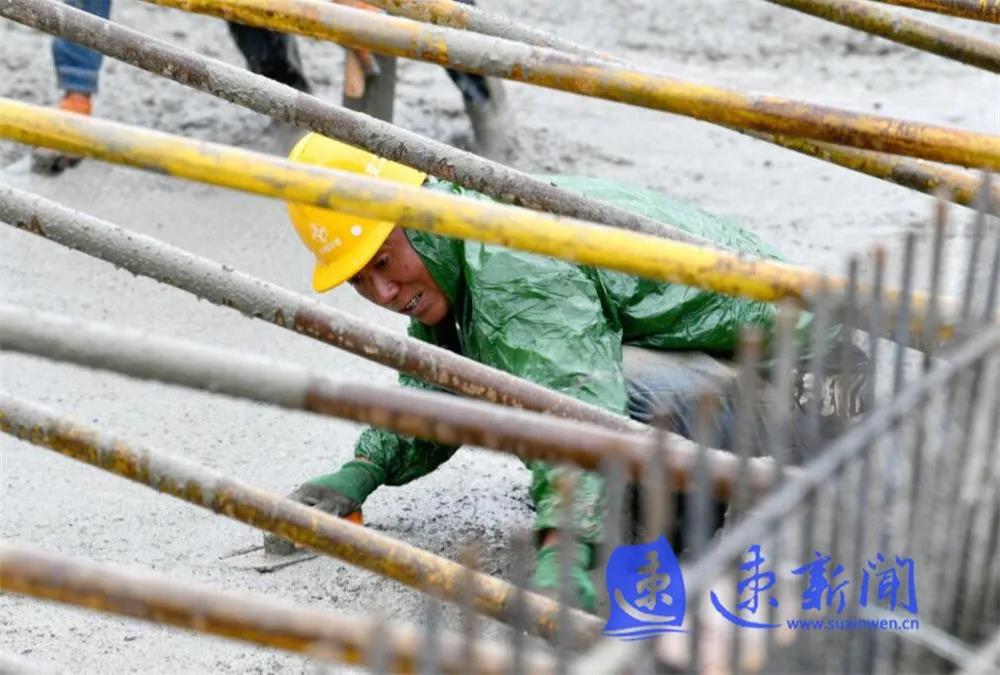 10月3日,宿遷市上海路(高鐵站連接線)改造二期工程項目工地工人正在雨中進行施工作業(yè),混凝土澆筑、起重機運轉(zhuǎn)、工程車往返,呈現(xiàn)出一派熱火朝天的勞動場景。