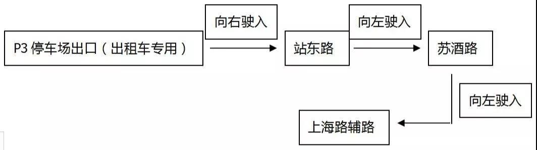 排隊等待區(qū)接到客人后,出租車進入站東路后右拐行至與蘇酒路交叉口,左拐進入蘇酒路后再左拐進入上海路地面輔路,按照指示標志轉(zhuǎn)至發(fā)展大道、人民大道、世紀大道或迎賓大道。