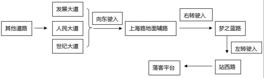 車輛可以通過外圍道路經(jīng)迎賓大道或發(fā)展大道、人民大道和世紀大道進入上海路輔路,直行通過夢之藍路交叉口后根據(jù)指示標志的引導(dǎo),分別進入P1、P2、P3停車庫。