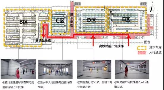 答:到站接客的車輛一律進入地下停車庫等待(配套有P1、P2、P3三個地下停車庫,分A、B、C、D、E五個區(qū),共約800個停車位),乘客下高鐵后,步行至相應(yīng)的停車庫。