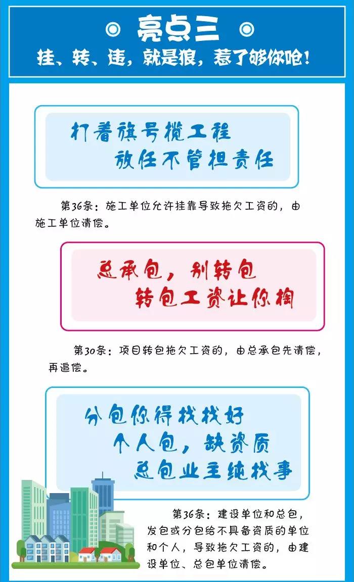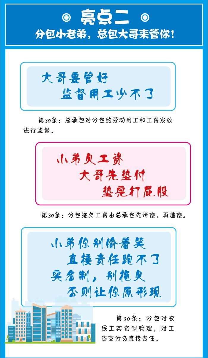 該條還規(guī)定了總包單位對(duì)分包單位的用工和工資發(fā)放進(jìn)行監(jiān)督的責(zé)任,這跟之前的總包單位單純的收取配合費(fèi)而對(duì)放任分包單位的用工及工資發(fā)放。這也為保障農(nóng)民工能切實(shí)拿到工資提供了法律依據(jù)。