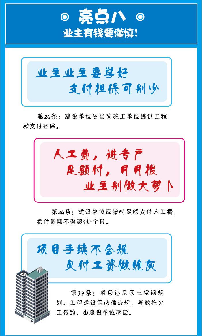 上述條款明確來(lái)總包設(shè)立農(nóng)民工工資專用賬戶的義務(wù),專門(mén)用于支付農(nóng)民工工資,建設(shè)單位應(yīng)按照合同約定及時(shí)向該賬戶內(nèi)撥付工資,如建設(shè)單位未及時(shí)撥付,總包單位可向人社和建設(shè)主管部門(mén)進(jìn)行匯報(bào),將建設(shè)單位納入欠薪預(yù)警系統(tǒng)。