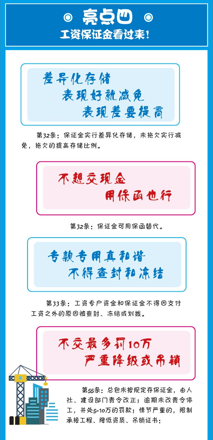 為切實(shí)保障總包能代發(fā)工資,《條例》規(guī)定其要存儲(chǔ)一定的工資保證金,工資保證金的數(shù)額施行差異化存儲(chǔ),未拖欠單位的比例降低,拖欠的提高比例。該工資保證金也可用金融機(jī)構(gòu)的保函代替,要注意此處是金融機(jī)構(gòu)的保函,不是普通的擔(dān)保公司的保函。
