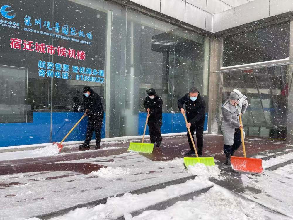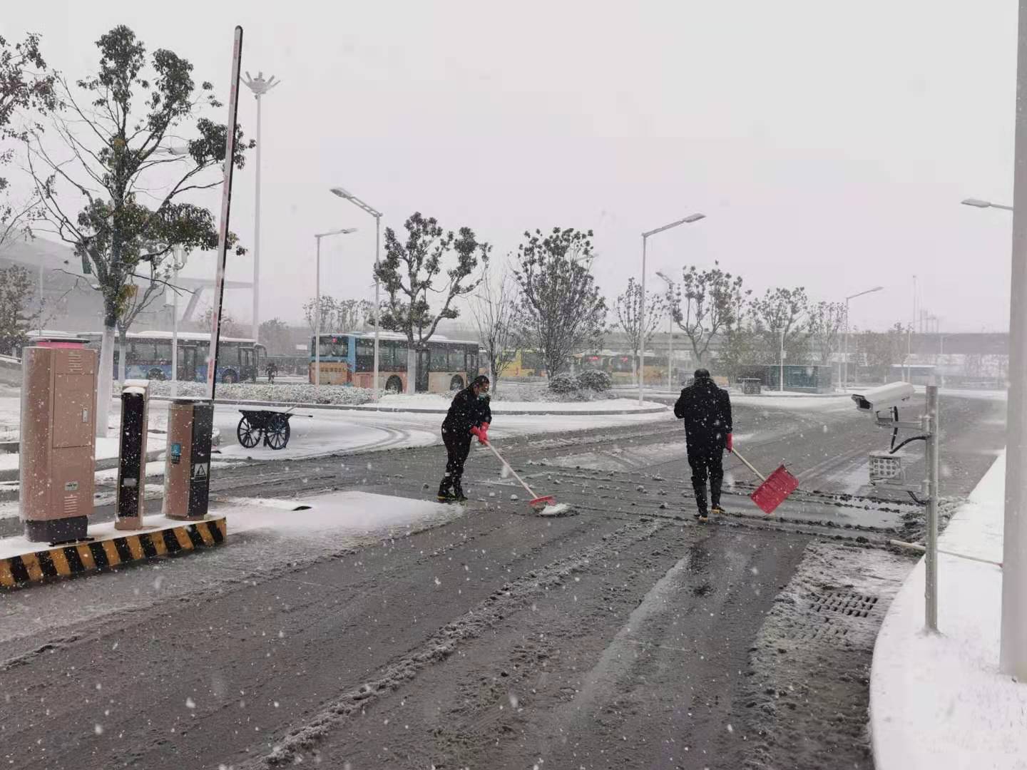 高鐵公司組織在崗職工和物業(yè)人員,利用推雪鏟、鐵鍬、掃帚等將高鐵宿遷站站前廣場(chǎng)積雪鏟開,對(duì)綜合客運(yùn)樞紐外道路、公交停車場(chǎng)等易結(jié)冰的路面進(jìn)行撒融雪處理,確保旅客出行安全。