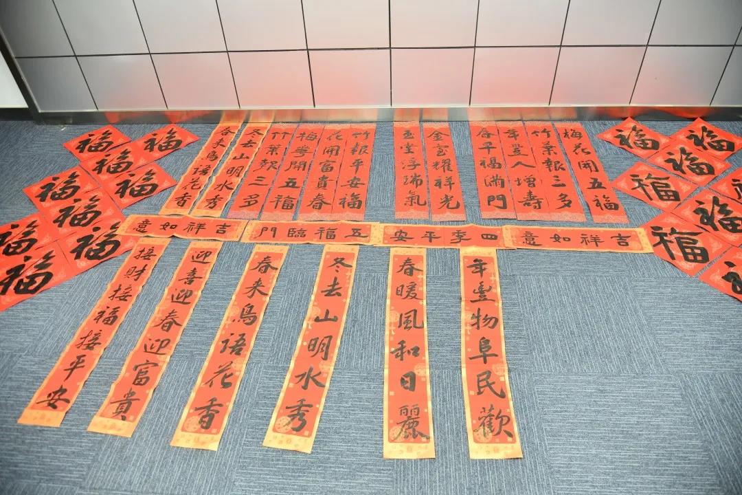 “無聯(lián)不成春,有聯(lián)春更濃”。活動(dòng)現(xiàn)場,一幅幅飽含吉祥寓意的春聯(lián)、一個(gè)個(gè)“福”字逐漸鋪滿兩邊的桌子和地上。行、隸、小篆等多種書體各顯神韻,滿場墨香包含著大家濃濃的祝福和對(duì)新年的期盼。