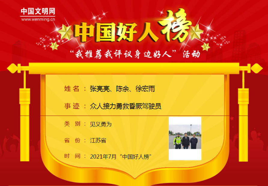 近日,中央文明辦發(fā)布2021年7月“中國好人榜”,其中,宿遷交通集團徐宏雨入選見義勇為“中國好人”。