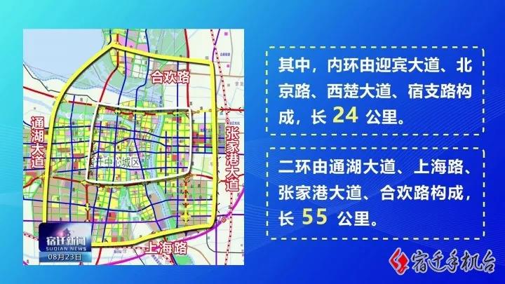 根據(jù)《規(guī)劃修編》,宿遷將形成“二環(huán)十射”的快速路網(wǎng),總里程166公里。其中,內(nèi)環(huán)由迎賓大道、北京路、西楚大道、宿支路構(gòu)成,長24公里;二環(huán)由通湖大道、上海路、張家港大道、合歡路構(gòu)成,長55公里;十射為迎賓大道北延、新?lián)P高速連接線、西楚大道北延、富春江路、宿支路東延、宿支路西延、北京路東延、徐淮路、黃河南路、發(fā)展大道,總長87公里。
