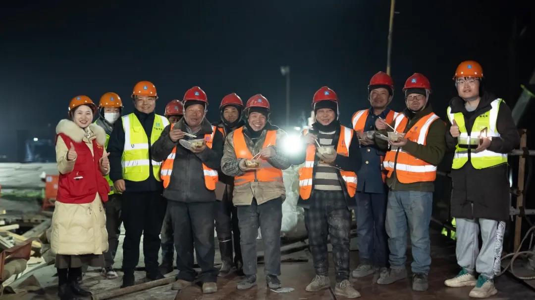 晚上組織志愿者為施工人員送上熱燙的湯圓、餃子,驅散冬季的寒冷。