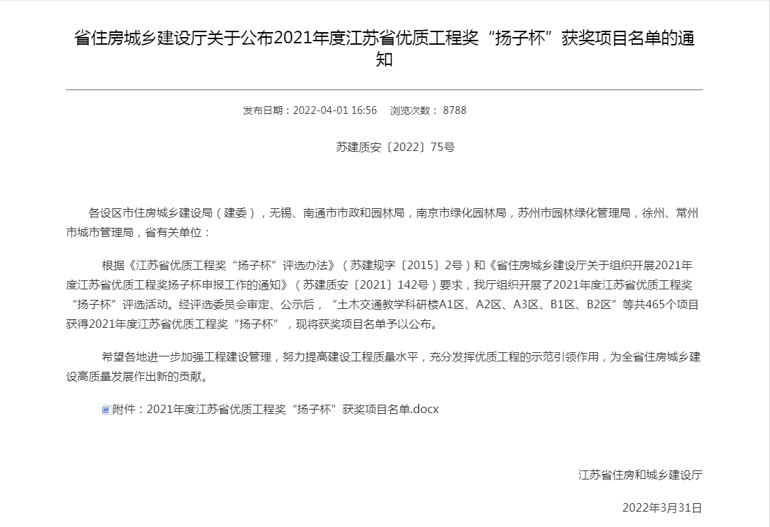“揚子杯”優(yōu)質工程獎是江蘇省內建筑工程質量最高榮譽獎。獎項的獲得是對宿遷交通集團項目建設“高起點設計、高標準規(guī)劃、高質量建設”原則的充分肯定,今后,宿遷交通集團也將繼續(xù)堅持“服務交通、發(fā)展惠民”的企業(yè)使命,以“品質工程”和“平安工地”創(chuàng)建為抓手,進一步強化質量意識、精品意識,砥礪奮進、真抓實干,努力打造品牌工程、樣板工程。