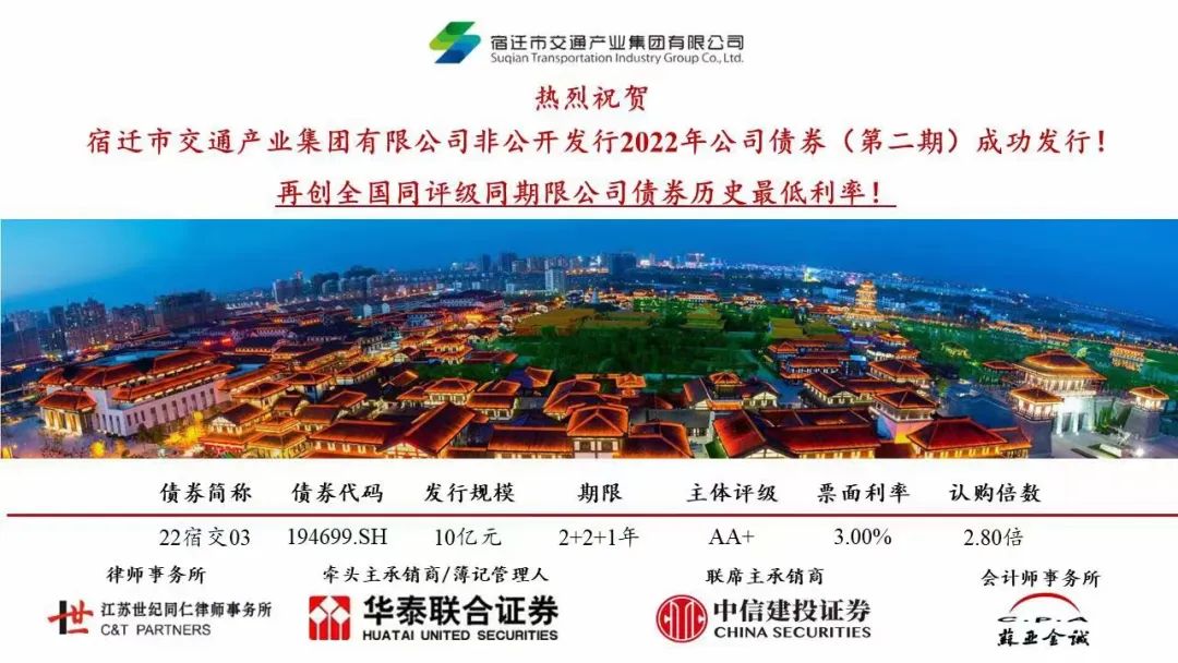 近日,集團非公開發(fā)行2022年公司債券第二期成功發(fā)行,發(fā)行規(guī)模10億元,期限2+2+1年,由華泰聯(lián)合證券、中信建投證券聯(lián)合承銷,票面利率3.00%,打破5月10日集團第一期3.08%發(fā)行利率,再創(chuàng)全國同評級同期限公司債券歷史最低利率記錄。