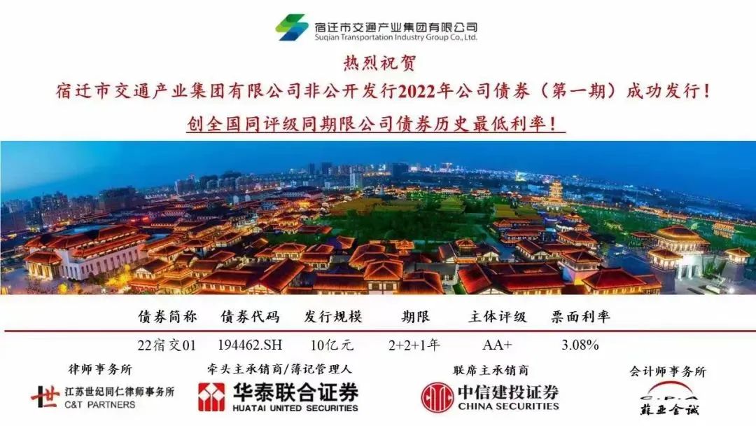 近日,集團(tuán)成功發(fā)行第一期非公開發(fā)行2022年公司債券,發(fā)行規(guī)模10億元,期限2+2+1年,由華泰聯(lián)合證券、中信建投證券聯(lián)合承銷,票面利率3.08%,創(chuàng)全國同評級同期限公司債券歷史最低利率。