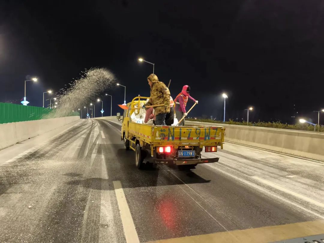 截至12月16日凌晨1時(shí),共使用防滑石子80噸、融雪鹽70噸、融雪劑60噸,投入融雪撒布機(jī)、掃雪車等作業(yè)車輛21臺(tái),出動(dòng)除雪人員200余人次;上海路、迎賓大道、北京路、洋河大道等養(yǎng)護(hù)路段全線無結(jié)冰通行。