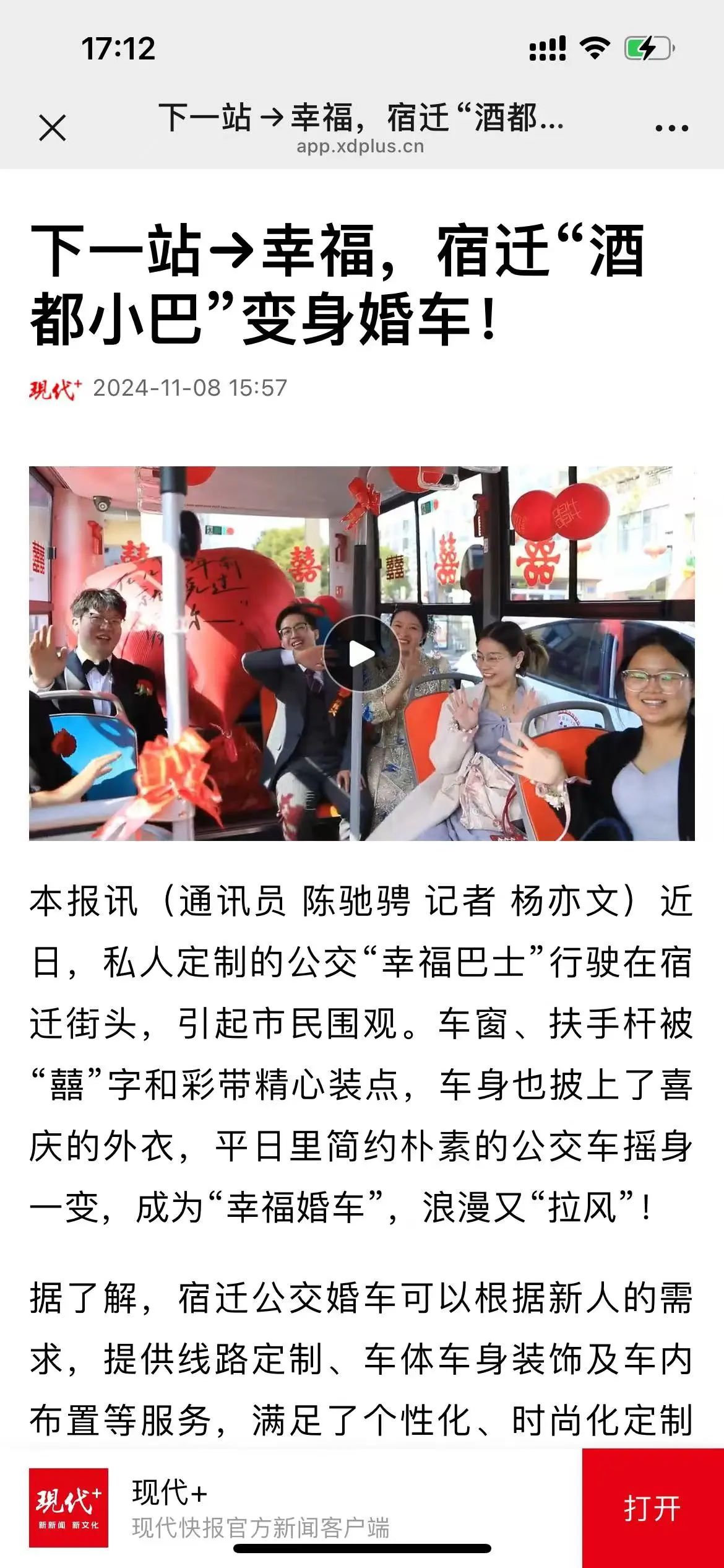 宿遷市城市公交公司經(jīng)營發(fā)展部負(fù)責(zé)人 花凡:新人可以根據(jù)自己喜愛的裝飾風(fēng)格進(jìn)行DIY,自行設(shè)計(jì)和布置公交婚車外觀、內(nèi)飾。例如可將新人的姓名、結(jié)婚日期等個性化元素融入其中,還可根據(jù)自己的喜好選擇行駛路線,經(jīng)過一些具有紀(jì)念意義的地點(diǎn),讓婚禮旅程更加具有個性化和紀(jì)念意義。