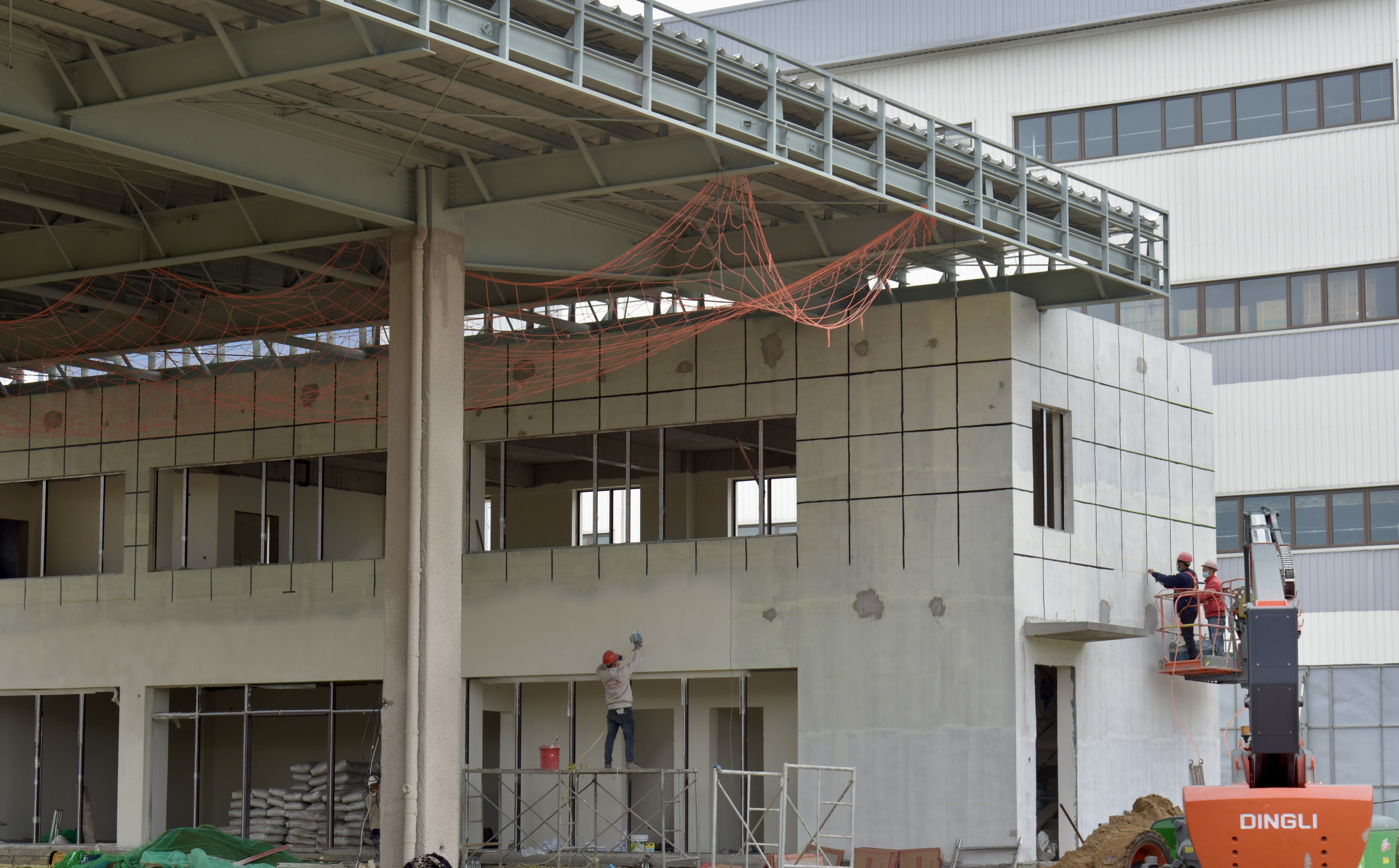 11月18日,在江蘇通湖物流園加油(充電)站建設現(xiàn)場,工人們正在進行站房外墻油漆施工。目前該項目已完成罩棚鋼結(jié)構(gòu)主框架吊裝、油罐埋設、管道鋪設等作業(yè)。
