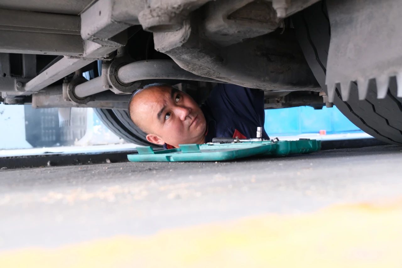 上午10點,陽光已經(jīng)變得格外“毒辣”,走進維修車間,一股混合著機油、橡膠和熱浪的灼熱氣息撲面而來。維修車間內(nèi),溫度高達40℃以上。剛駛?cè)胲囬g的公交車引擎蓋下,溫度更是接近60℃,站在旁邊都能感受到熱浪滾滾。維修工趙賀賀師傅正鉆在公交車底部,對車輛的底盤進行檢查,深藍色的工裝早已被汗水濕透,緊貼在背上。“發(fā)動機剛停機,溫度有70℃以上,手不能觸碰。”趙師傅抹了把臉笑道,“但再熱也得修,不能讓一輛‘病車’上路。”