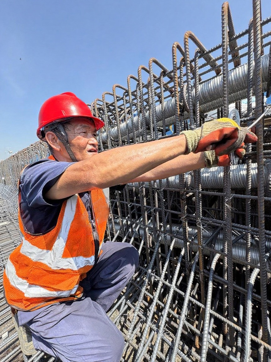 在鋼筋綁扎施工作業(yè)中,工人們正頂著烈日進(jìn)行鋼筋的綁扎。為了防止鋼筋被暴曬后溫度過(guò)高影響施工安全,項(xiàng)目部特意準(zhǔn)備了隔熱手套,并要求施工人員每工作40分鐘就到休息點(diǎn)降溫。“雖然熱,但看著新修道路一點(diǎn)點(diǎn)向前延伸,心里是比較驕傲的。”有著15年筑路經(jīng)驗(yàn)的老工人李師傅說(shuō),這條高速建成后擴(kuò)至雙向十車道,車輛再多也不會(huì)堵車了,一想到這里,再熱也有干勁了。