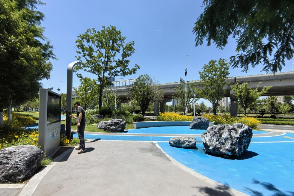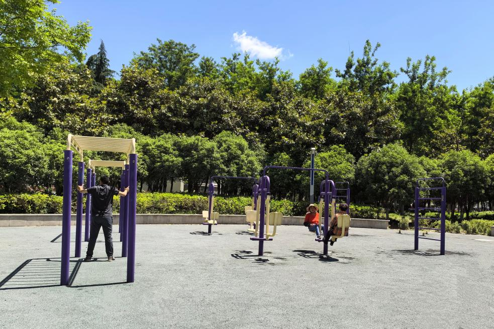 迎賓大道綠道全長(zhǎng)8公里,通過(guò)串聯(lián)小區(qū)、街角廣場(chǎng)、綠地公園、橋下空間等地塊,實(shí)現(xiàn)慢行系統(tǒng)與線性空間的有效整合。綠道在串聯(lián)道路兩側(cè)原有綠地空間的基礎(chǔ)上,合理增加了小游園、主題公園、活動(dòng)廣場(chǎng)、智慧健身等功能性場(chǎng)地,如新建各類(lèi)休閑健身場(chǎng)地8處、樂(lè)享驛站6座、智慧健身步道1.5公里,新增休閑座椅、景觀燈、健身器材、兒童游樂(lè)設(shè)施、垃圾桶、無(wú)障礙設(shè)施等配套便民設(shè)施,沿線增加微山花園、繡球花園、碉堡花園等多個(gè)游園節(jié)點(diǎn),打造滿足全齡活動(dòng)的“樂(lè)享游園”。