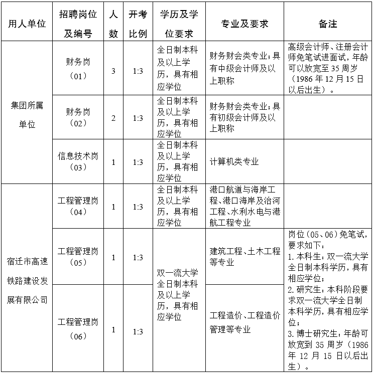 5. 具備招聘崗位要求的其它資格和條件。具體詳見(jiàn)《宿遷市交通產(chǎn)業(yè)集團(tuán)有限公司2022年招聘崗位表》。