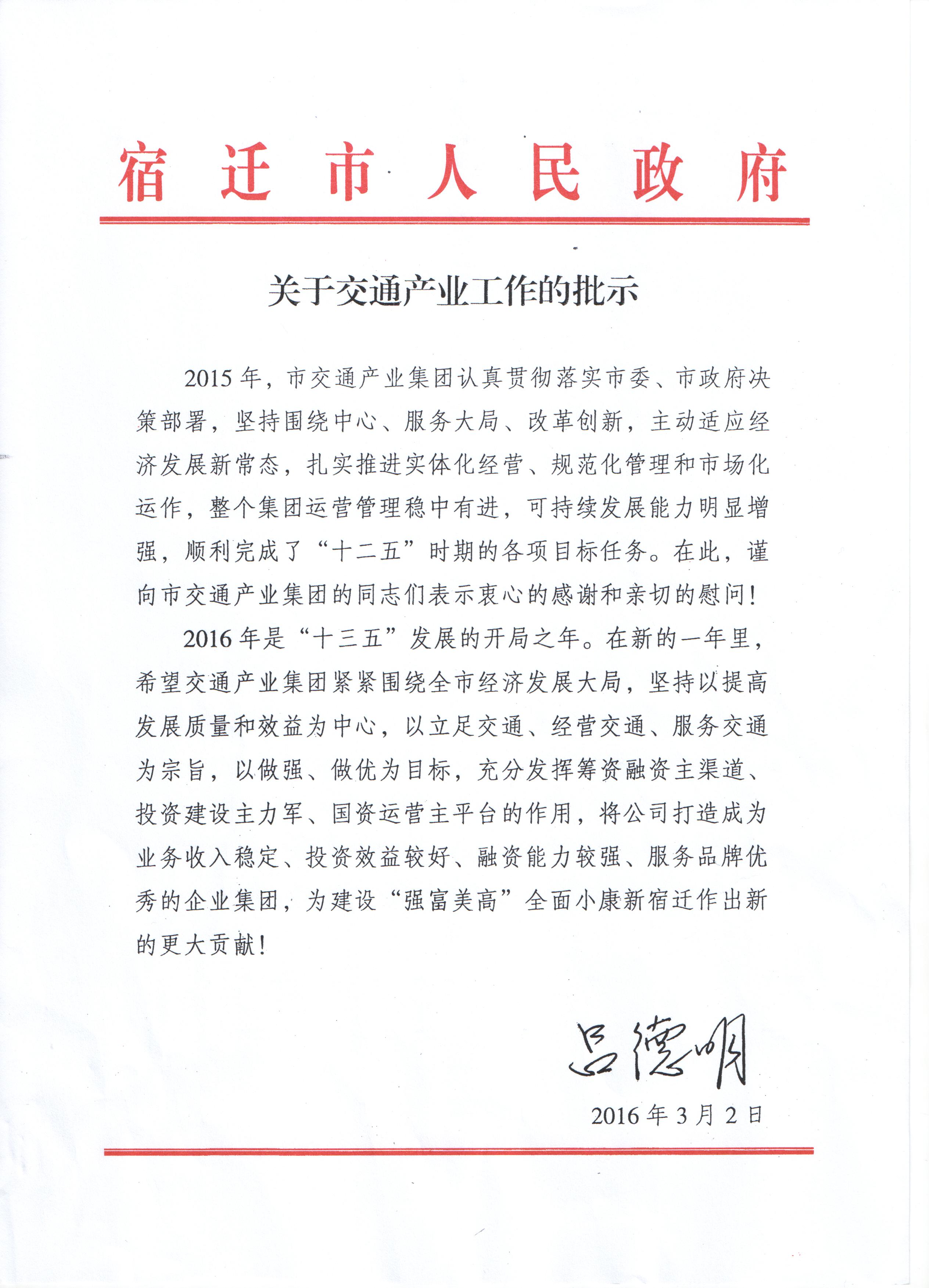 市委常委、常務(wù)副市長呂德明關(guān)于交通產(chǎn)業(yè)工作的批示